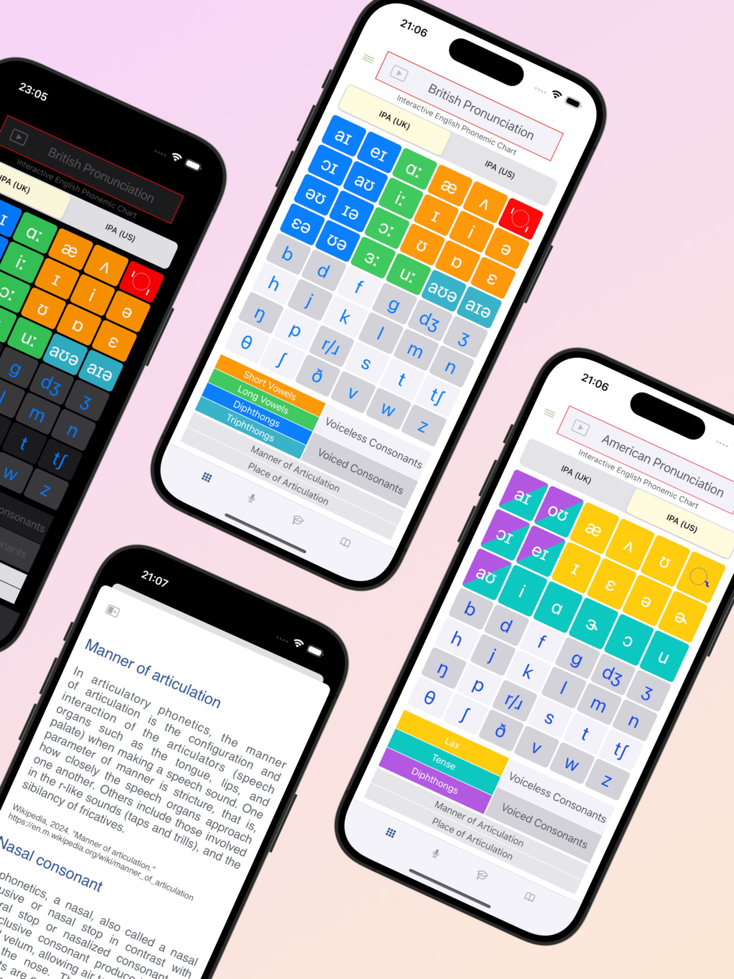 Phoneticus® offers both American English and British English phonemic charts, complemented by hundreds of offline audio recordings from native speakers of both accents. Our glossary defines essential technical terms such as “affricate,” “alveolar,” and “fricative,” providing links to Wikipedia for deeper exploration.